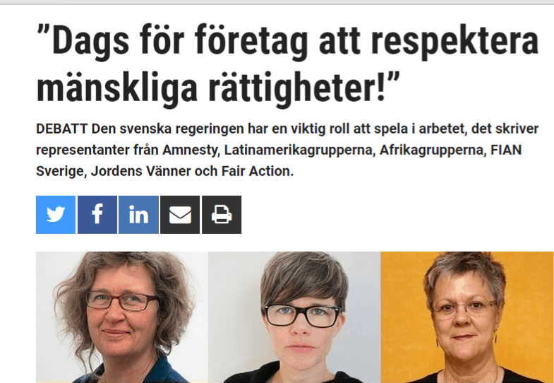 24 oktober 2016 - Debattartikel i Aktuell Hållbarhet Nu i oktober samlas återigen FN:s mellanstatliga arbetsgrupp som har i uppdrag att ta fram ett fördrag gällande företag och deras ansvar att respektera mänskliga rättigheter. Den svenska regeringen har en viktig roll att spela i det arbetet, skriver representanter från Amnesty, Latinamerikagrupperna, Afrikagrupperna, FIAN Sverige, Jordens Vänner och Fair Action.