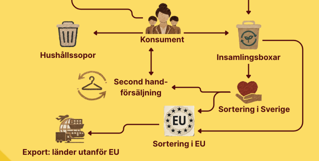 Vad händer med resten? Majoriteteten exporteras vidare, först inom Europa, sedan till länder i Afrika och Asien. I Afrika säljs cirka 60 procent vidare på den inhemska andrahandsmarknaden, men det innebär att 40 procent blir avfall, och dumpas på stränder, i naturen och i havet. I Sverige saknas kapaciteten att ta hand om vårt eget textilavfall, samtidigt som Afrika och Asien förväntas ta hand om majoriteten av Europas insamlade textilier.
